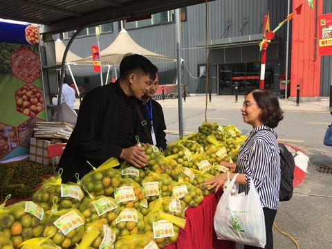 | Le stand de kaki sans pépin dans le cadre de la Semaine de présentation du kaki et des produits agricoles bio de Bac Kan. |