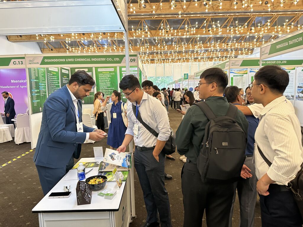| Des visiteurs devant un stand d’exposition de produits de protection végétale d’une entreprise indienne. |