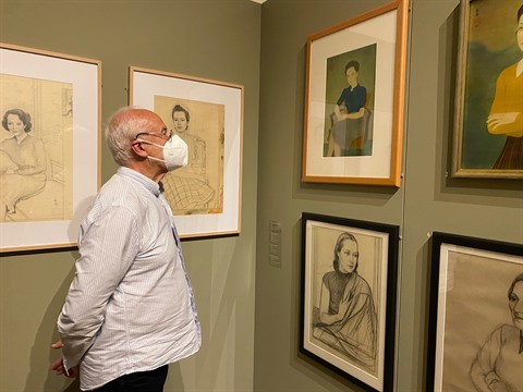 | Un visiteur admire des œuvres de l'exposition. |