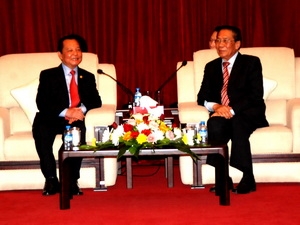 | Le président du Laos, Choummaly Saynhasone (droite) reçoit le secrétaire du Comité municipal du PCV pour Hô Chi Minh-Ville, Lê Thanh Hai. |