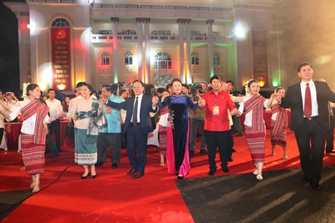 | La présidente de l'Assemblée nationale vietnamienne Nguyên Thi Kim Ngân (1er plan, centre) et son homologue lao Pany Yathotou (1er plan, 2e à gauche), et des participants du festival. |
