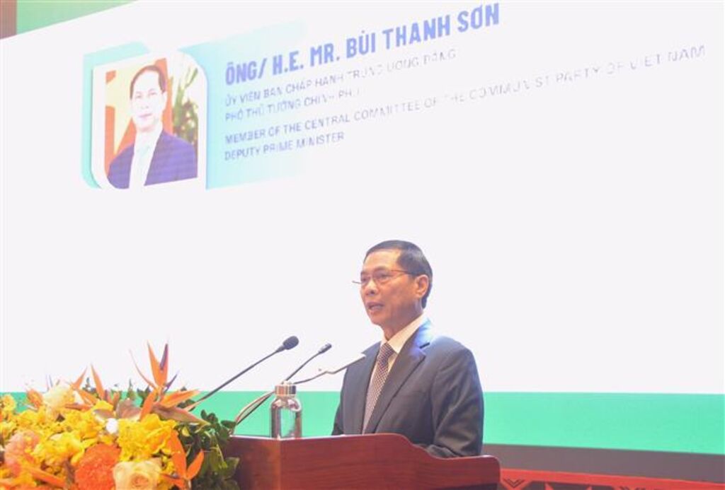 | Le vice-Premier ministre et ministre des Affaires étrangères, Bùi Thanh Son, prenant la parole lors du symposium. |