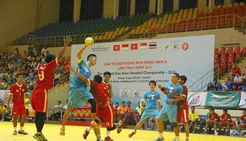 | Le Vietnam (maillots bleus) rencontre l'Indonésie lors de la première journée de compétition du Championnat d’Asie du Sud-Est de handball 2015. |