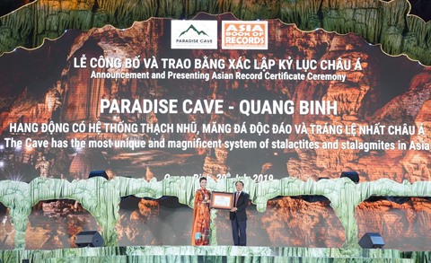 À cette occasion, le ministère de la Culture, des Sports et du Tourisme, en coopération avec le Comité populaire provincial, a annoncé la décision du Premier ministre sur l'approbation du plan de développement du parc national de Phong Nha - Ke Bàng. Le Comité d’organisation a aussi annoncé et remis le certificat de reconnaissance du record d’Asie à la grotte Thien Duong ayant le système de stalactites, de stalagmites le plus original et le plus fastueux en Asie.