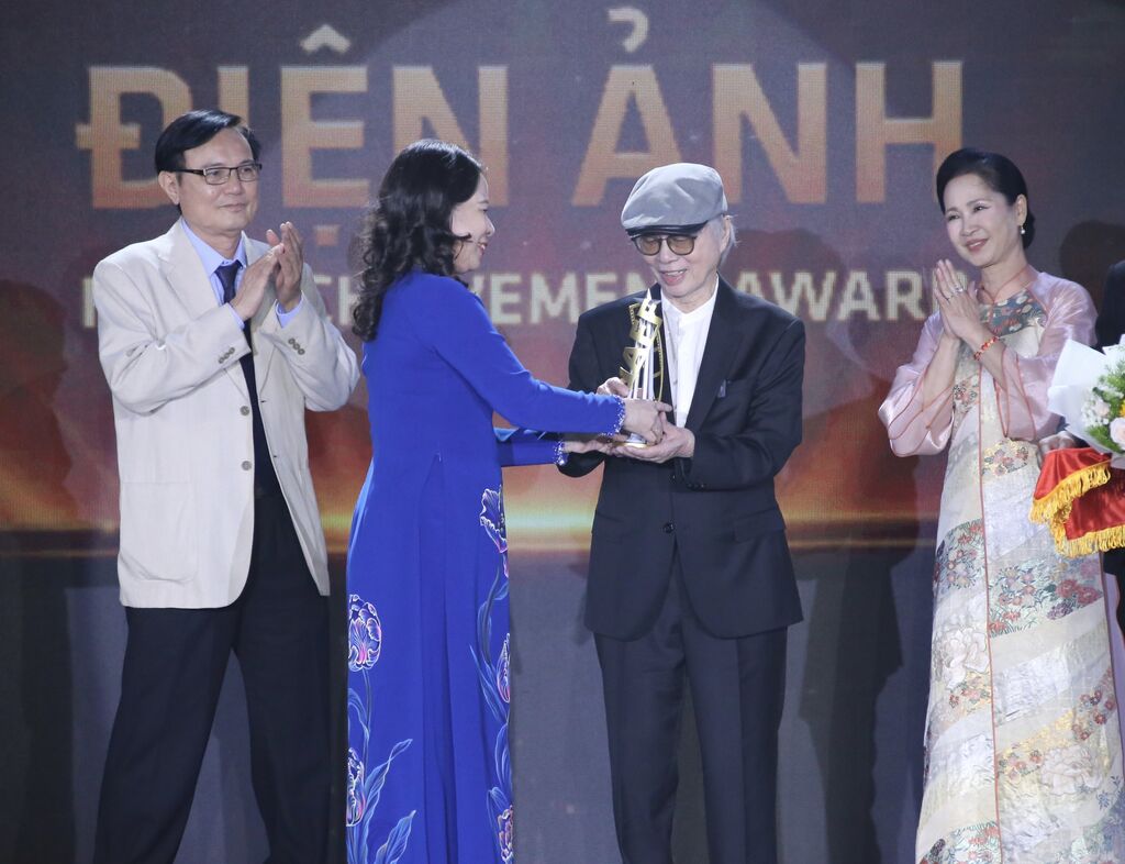 | La vice-présidente de la République, Vo Thi Anh Xuân, le Prix d'honneur au réalisateur Dang Nhât Minh lors de l'ouverture du festival. |