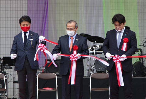 | L'ambassadeur du Vietnam au Japon, Vu Hông Nam (centre), coupe le ruban pour lancer le festival du Vietnam au Japon, le 7 novembre au parc Yoyogi, à Tokyo. |