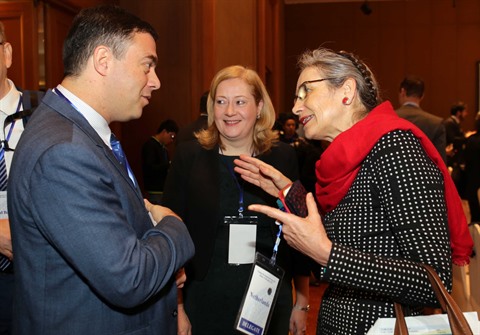 | Des délégués discutent en marge du forum, le 13 décembre à Hanoï. |