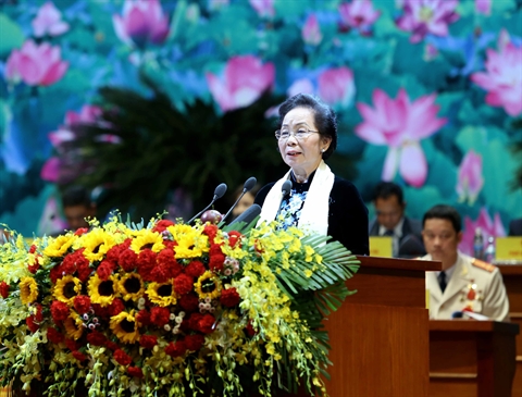 | La vice-présidente vietnamienne Nguyên Thi Doan présente un rapport sur les résultats des mouvements d'émulation. |