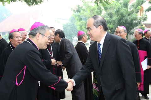 | Nguyên Thiên Nhân (droite), et le président du Conseil épiscopal du Vietnam, Bùi Van Doc, |