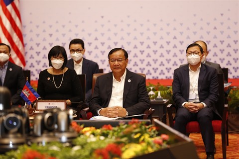 | Prak Sokhon (centre), vice-Premier ministre et ministre des Affaires étrangères et de la Coopération internationale du Cambodge, préside la réunion |
