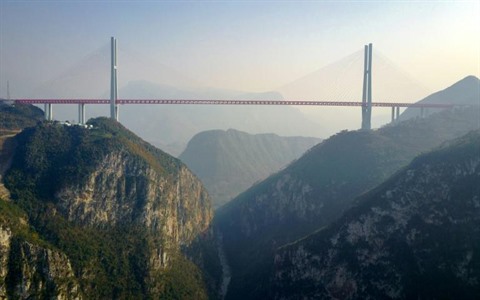 | Le pont Beipanjiang, qui culmine à 565 m au-dessus d'une rivière près de Bijie (Sud-Ouest de la Chine), le 28 décembre 2016. |