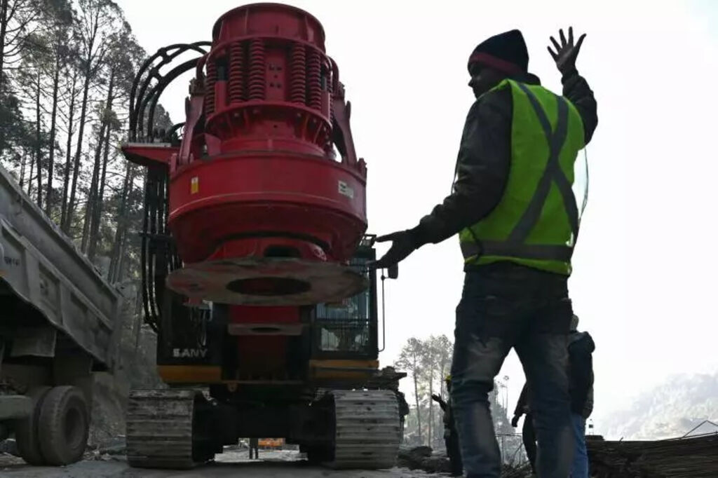 | Une nouvelle machine arrive pour tenter un forage vertical afin d'atteindre les 41 ouvriers piégés dans l'effondrement du tunnel auquel ils travaillaient, dans l'État himalayen de l'Uttarakhand, dans le Nord de l'Inde, le 25 novembre 2023. |