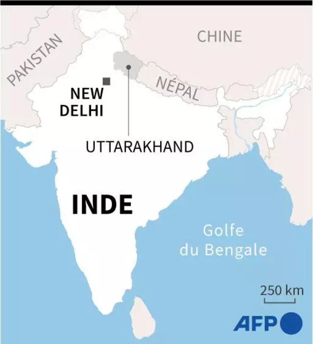 | Carte d'Inde localisant l'État d'Uttarakhand,dans l'Himalaya indien, où des ouvriers ont été piégés dans l'effondrement d'un tunnel routier. Photo : AFP/VA/CVN |