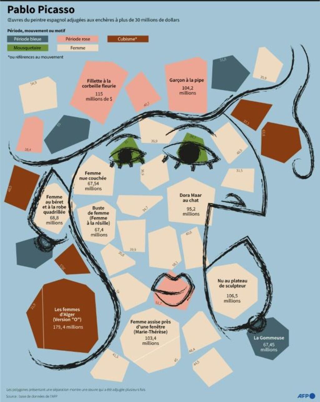 | Oeuvres de Pablo Picasso adjugées aux enchères à plus de 30 millions d'USD. |