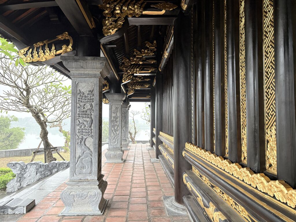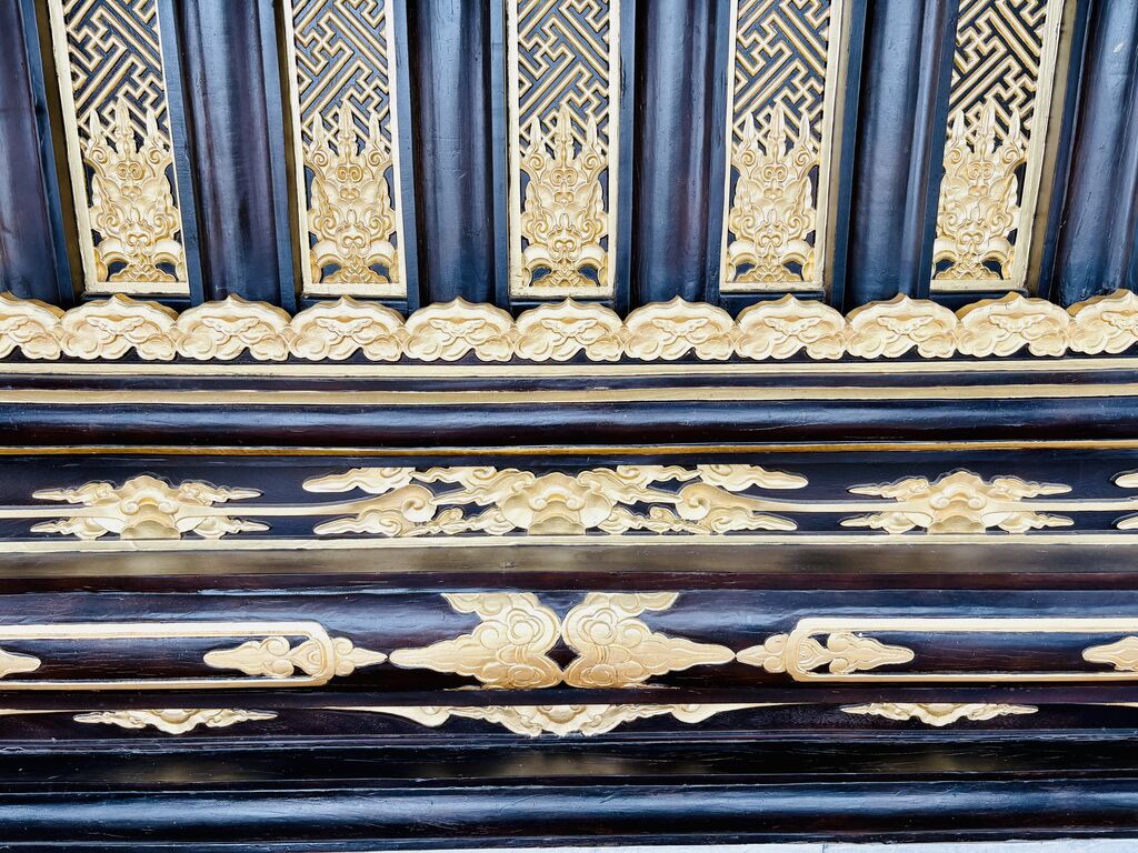 L’édifice, entièrement en bois de fer noir, arbore des toitures de tuiles à double courbure, typiques des temples anciens. Leurs extrémités, ornées de motifs de dragons et de phénix encadrant une perle, sont dorées à la feuille, créant un effet visuel majestueux.