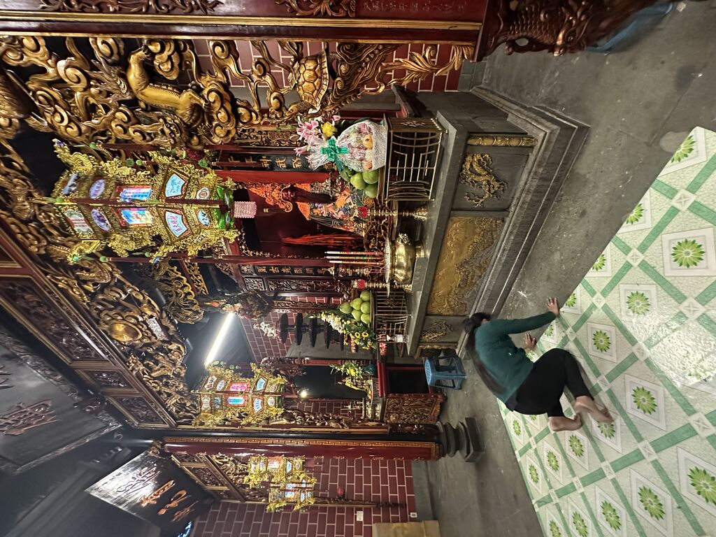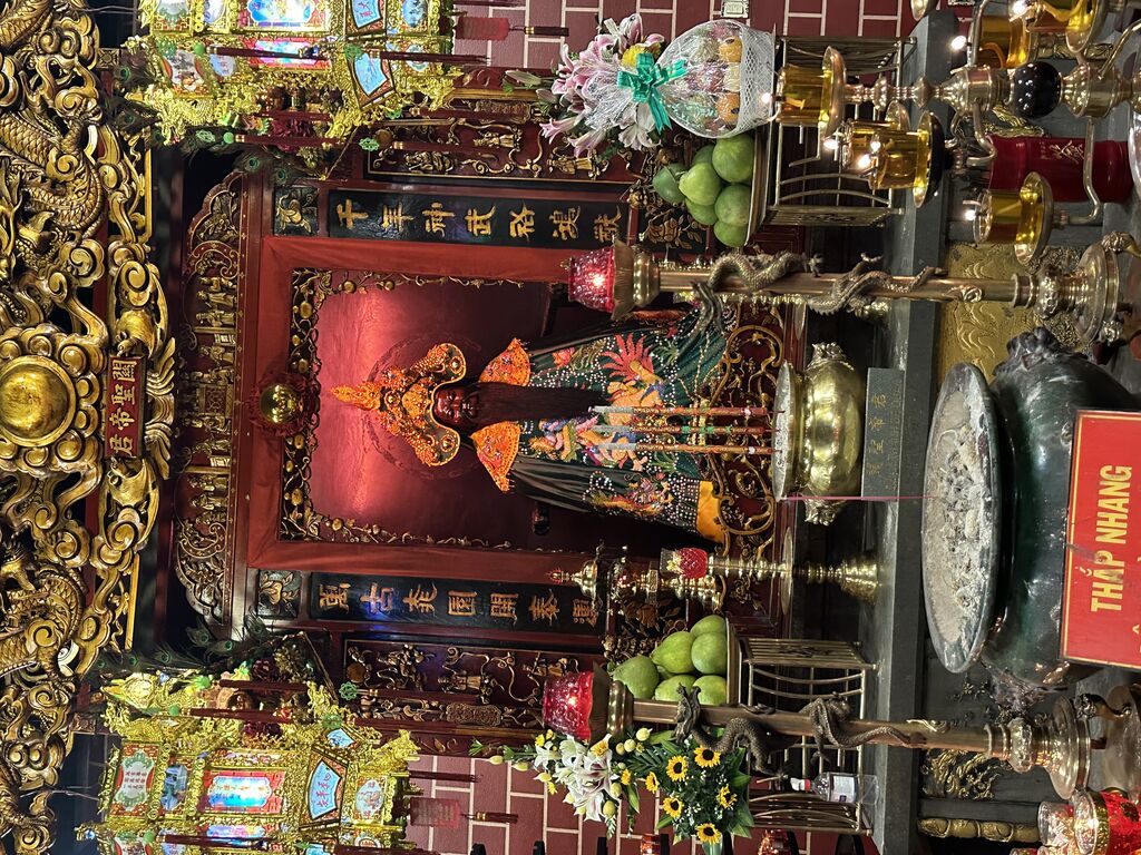 La salle principale abrite une statue de Guan Yu. Cette statue repose sur un autel magnifiquement décoré, orné de deux peintures de dragons. La statue de Guan Yu, vêtu d'une chemise en brocart bleu, trône majestueusement. À ses côtés se tiennent ses deux fidèles qui l'accompagnaient à l'époque des Trois Royaumes en Chine. Les deux pavillons adjacents servent d'autels pour vénérer Thiên Hâu Thanh Mâu (une divinité importante dans les croyances des Chinois et des Sino-Vietnamiens) et Kim Hoa Nương (une divinité qui veille à l'accouchement des enfants et protège ces derniers), honorée et vénérée par la communauté chinoise.