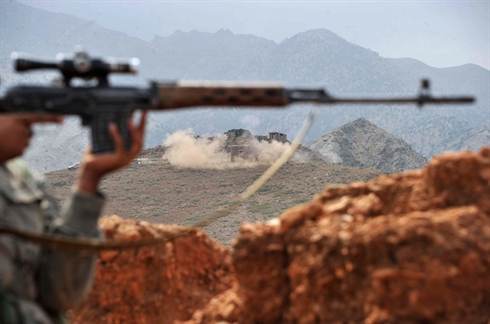 | La fumée monte suite aux affrontements entre les forces de sécurité afghanes et les insurgés talibans lors d'une opération anti-talibans dans le district de Dur Baba près de la frontière pakistano-afghane dans la province orientale de Nangarhar, le 25 septembre. |