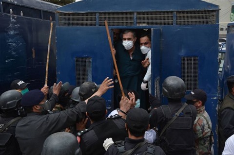 | Des policiers pakistanais arrêtant des médecins lors d'une manifestation à Quetta, le 6 avril. Photo : AFP/VNA/CVN |