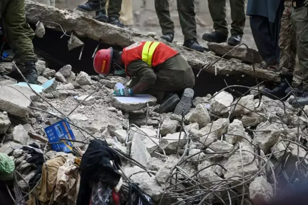 | Un secouriste fouille les décombres d'un immeuble d'habitation effondré à Karachi, le 4 juillet 2025. |