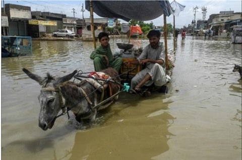 | Un vendeur de légumes traverse une rue inondée de Karachi, au Pakistan, dans sa charette tirée par un âne, le 28 août 2020. |