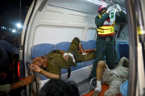| Un secouriste dispense les premiers soins à un homme blessé par l'explosion d'une bombe à Raiwind, dans la banlieue de Lahore, le 14 mars. |