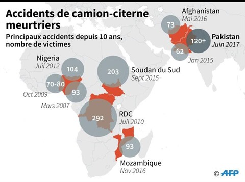 | Principaux accidents de camion-citerne depuis dix ans et nombre de victimes, après l'incendie d'un camion le 25 juin au Pakistan. |