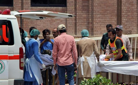 | Des ambulanciers transportent des blessés dans l'incendie d'un camion-citerne à l'hôpital de Multan, le 25 juin au Pakistan. |