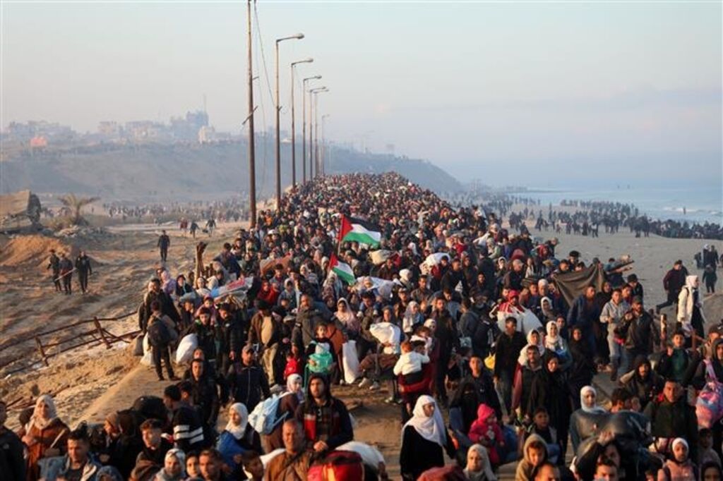 | Des dizaines de milliers de Palestiniens déplacés sont en route pour rentrer chez eux dans le nord de la bande de Gaza, le 27 janvier. |