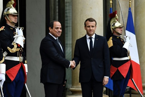 | Les présidents français et égyptien Emmanuel Macron (droite) et Abdel Fattah al-Sissi devant le palais de l'Élysée, le 24 octobre 2017. |