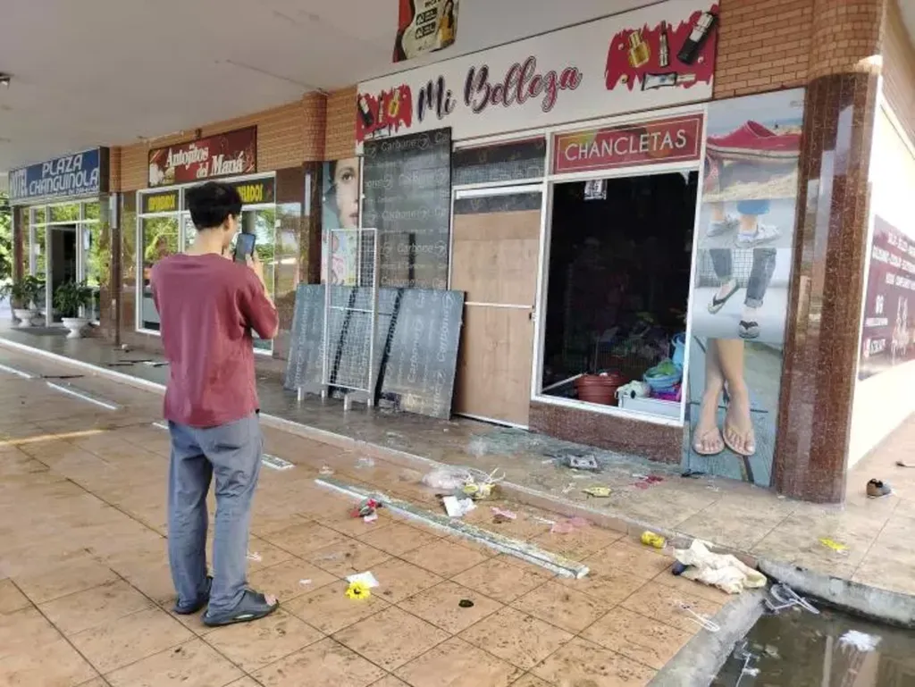 | Un homme prend des photos des dégâts dans un magasin après des pillages et de violentes manifestations à Changuinola, au Panama, le 20 juin. |