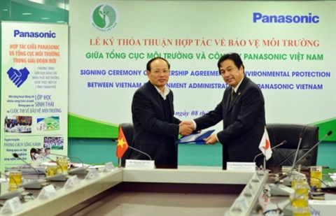 | Le chef du Département général de l’environnement, Nguyên Van Tài (gauche), et le représentant de Panasonic Vietnam, Yamamoto Masahiro, lors de la signature de l’accord de coopération entre les deux parties. |