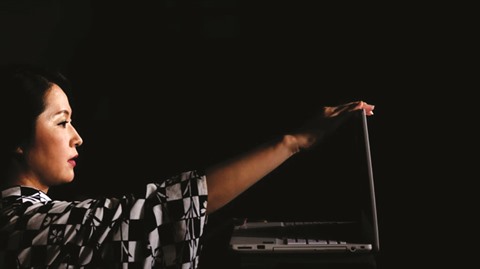 | La geisha "Chacha" regarde son ordinateur portable avant une soirée en ligne avec des clients de "Meet Geisha" à Hakone (Japon). |