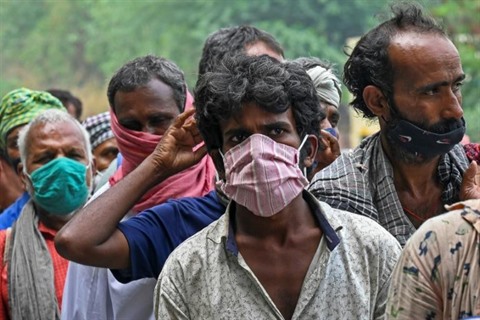 | Des Indiens sans domicile fixe, notamment des travailleurs journaliers, font la queue lors d'une distribution de nourriture à New Delhi, le 20 mai. |