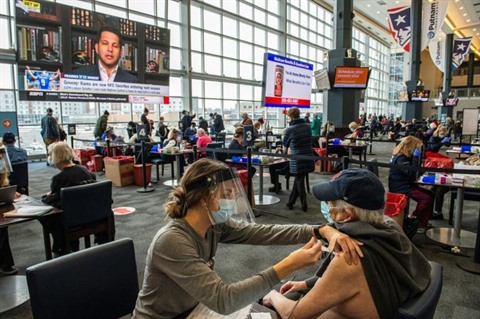 | Des personnes se font vacciner dans un stade Foxborough au Massachusetts (États-Unis) le 1er février. |