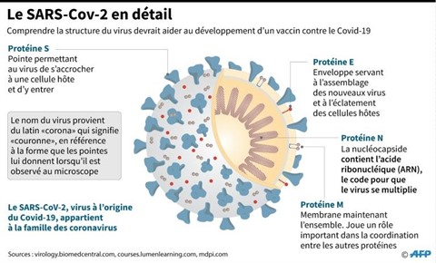 | La structure du SARS-Cov-2, le coronavirus à l'origine du COVID-19. |