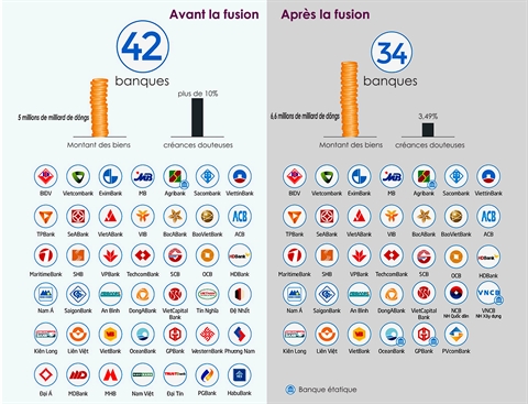 La réforme bancaire est positive, les banques commerciales n’étant plus qu’au nombre de 34 contre 42 il y a quatre ans. Les huit entités disparues sont les banques Tin Nghia, Dê Nhât, Habubank, Western Bank, Dai A, Dai Tin, Phuong Nam, MHB, MDBank et PGBank. La solvabilité des banques commerciales est garantie. Autres fruits de cette réorganisation, la valeur totale des actifs des organismes bancaires a augmenté de 20%, passant de 5 millions de milliards de dôngs à 6,6 millions de milliards.