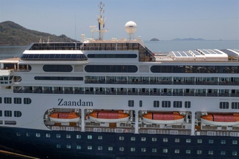 | Vue du paquebot Zaandam, battant pavillon néerlandais et exploité par Holland America (groupe Carnival), le 27 mars à Panama City. |