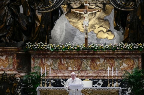 | Le pape François s'apprête à prononcer la bénédiction Urbi et Orbi, après avoir célébré la messe de Pâques, le 4 avril à la basilique Saint-Pierre au Vatican. |