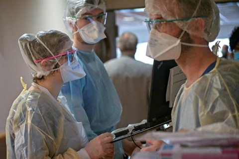 | Des personnels soignants dans l'unité de soins intensifs de l'hôpital de Tours, le 2 avril |
