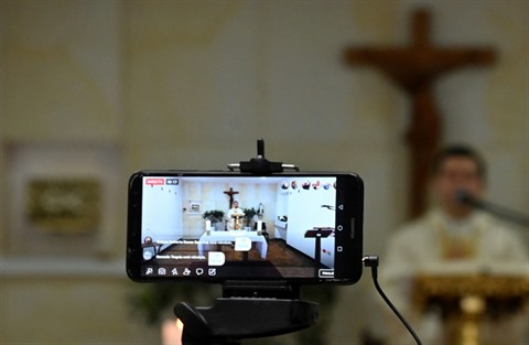 | Un prêtre célèbre une messe en ligne à Bogota, le 9 avril 2020 en Colombie. |