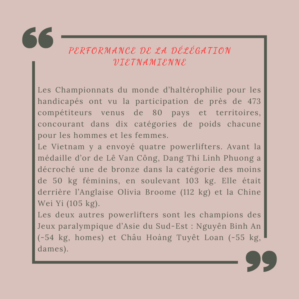 Aux Jeux paralympiques de Tokyo 2021, Lê Van Công n’avait remporté qu’une médaille d’argent en raison de son poids et d’une blessure à l’épaule. Il pesait en effet 100 gr de plus que le Jordanien Omar Qarada, bien que les deux aient réussi à soulever 173 kg.