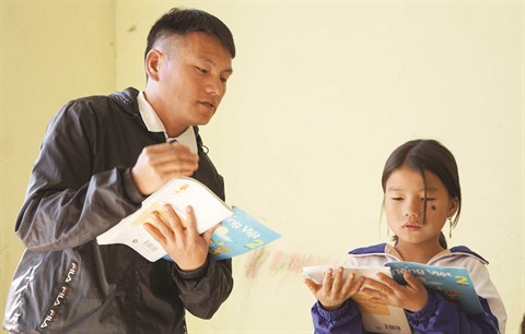 | L’instituteur Sùng A Chai enseigne à une élève de 2e classe à lire. |