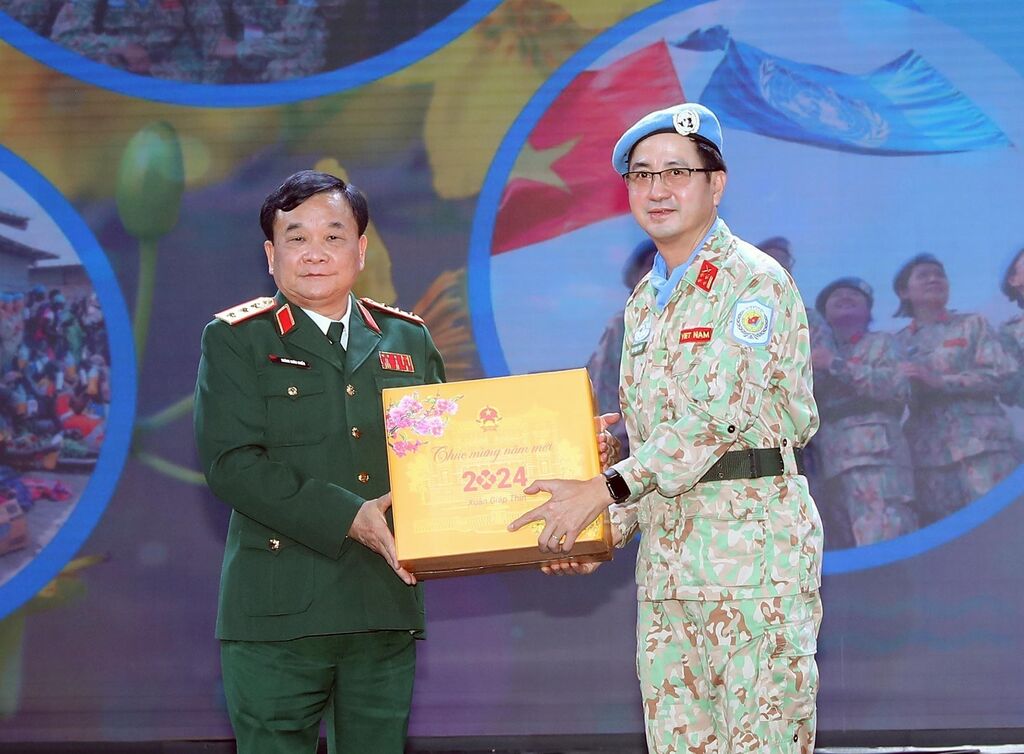 | Le général de corps d’armée Hoàng Xuân Chiên, vice-ministre vietnamien de la Défense, a remis le cadeau aux Casques bleus vietnamiens lors d'un programme de connexion se tenant le 5 février. |