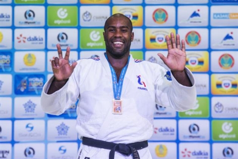 | Teddy Riner après avoir conquis son 8e titre de champion du monde, le 29 août à Astana. |