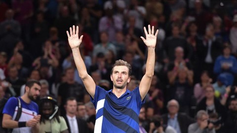 | Le Français Julien Benneteau bras levés après sa victoire face au Croate Marin Cilic en quarts de finale au Masters 1000 de Paris-Bercy, le 3 novembre. |
