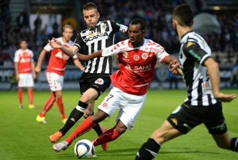 | Le milieu d'Angers Pierrick Capelle (gauche) à la lutte avec l'attaquant de Reims Odaïr Fortes (No7), le 22 septembre à Angers. |