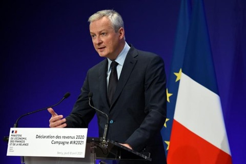 | Le ministre français de l'Économie, Bruno Le Maire, lors d'une conférence de presse, le 8 avril à Paris |