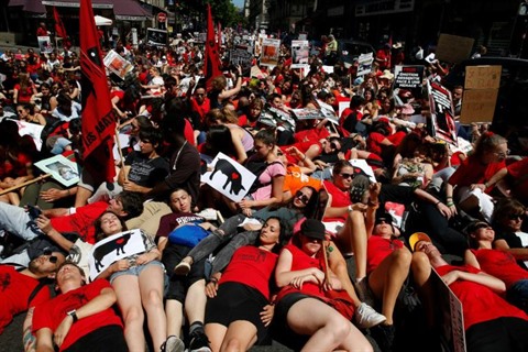 | Des manifestants vêtus de rouge pour demander la "fermeture des abattoirs", à l'appel de l'association de défense des animaux L214, le 10 juin à Paris. |