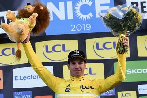 | Le Néerlandais Dylan Groenewegen vainqueur de la 2e étape de Paris-Nice, entre Les Bréviaires et Bellegarde, le 11 mars. |