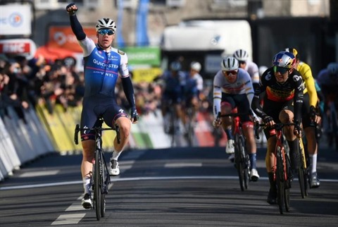 | La joie du Néerlandais Fabio Jakobsen, vainqueur de la 2e étape de Paris - Nice devant le Belge Wout Van Aert, le 7 mars à Orléans. |